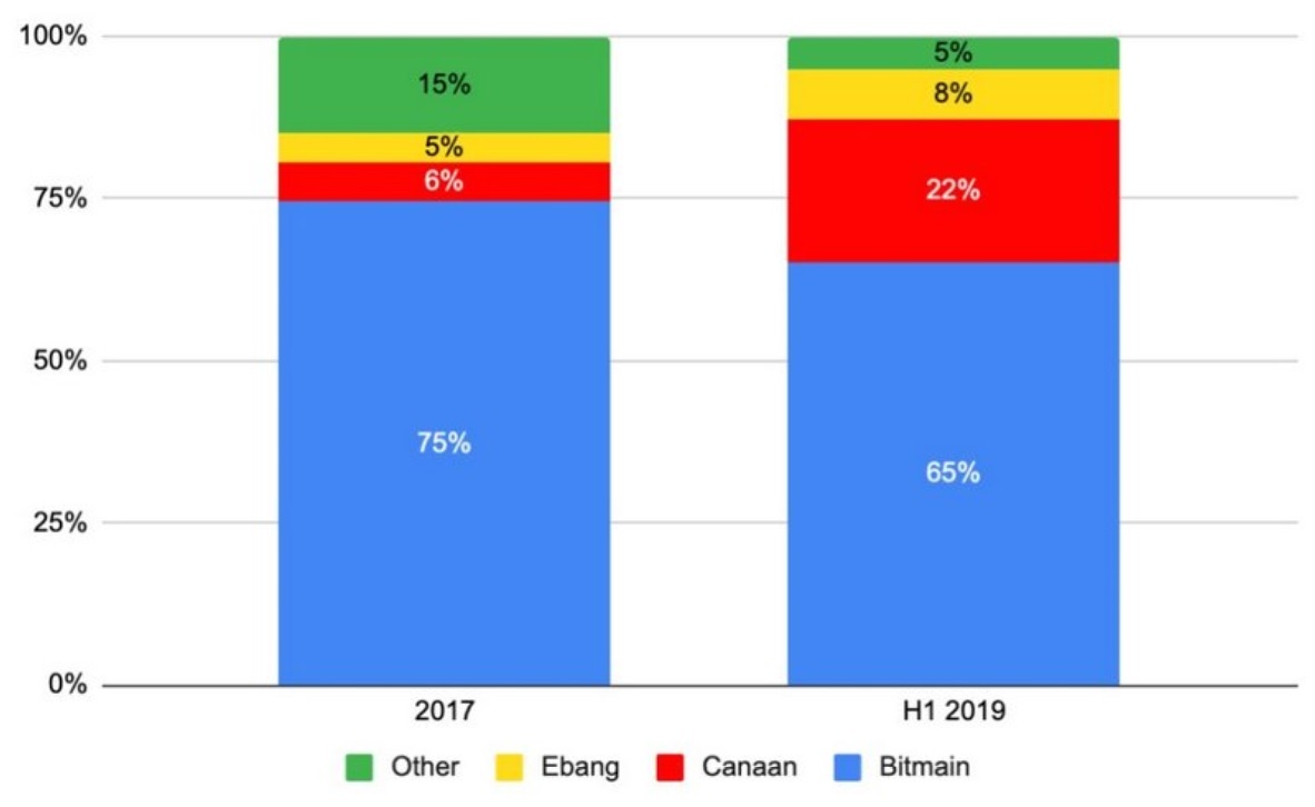 С 75% в 2017 году доля Bitmain сократилась до 46% по итогам прошлого года. Только за 2019 год доля MicroBT выросла с 9% до 35%, в то же время Canaan Creative и Ebang просто сохранили позиции — 12% и 4% соответственно.